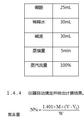 待消化管內溶液冷卻至室溫后,將消化管放置于定氮儀上,開始蒸餾滴定。定氮儀設置程序如下:
