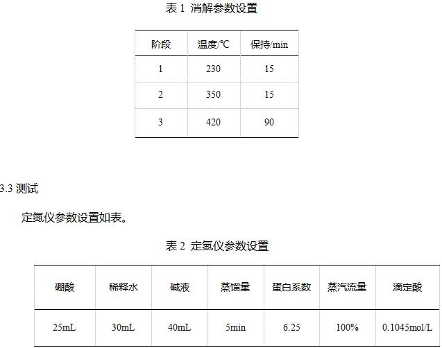 稱取經過烘干(105℃2小時)并混合均勻的樣品0.2g(精確至0.1mg)左右,加入消化管。加入混合催化劑:3g硫酸鉀,0.2g硫酸銅,沿消化管壁加入濃硫酸10mL。