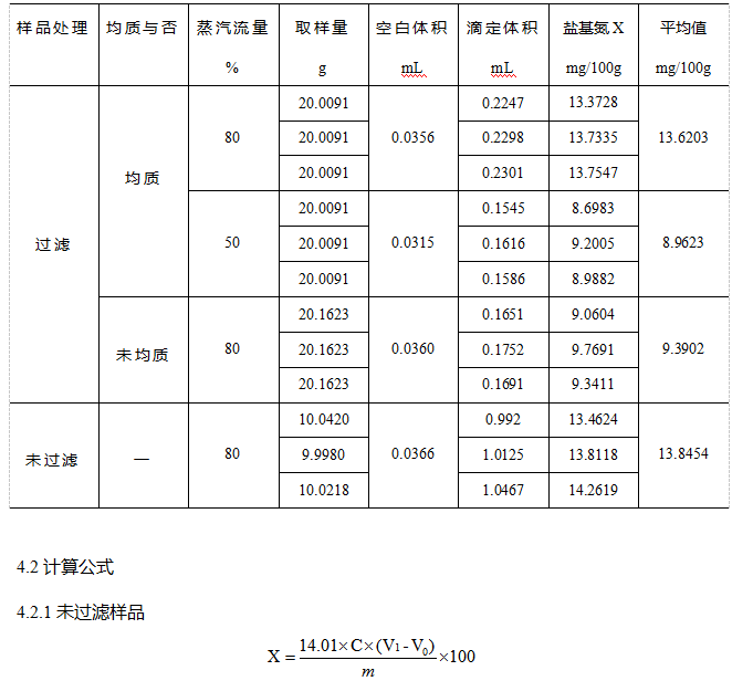 1)經本實驗驗證,不可采用未過濾方法進行測試,雖然未過濾方法能夠測試出結果,但因肉類未經過濾直接蒸餾易導致肉的碎屑殘留在儀器內部,難以清洗,損壞儀器。
