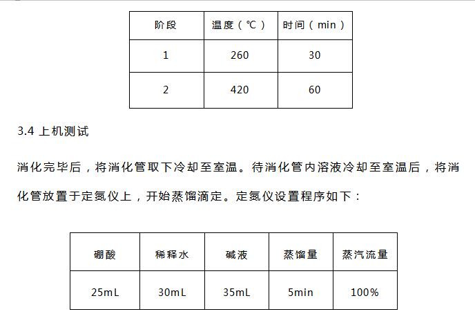 硫酸(分析純)、硼酸(分析純)、氫氧化鈉(分析純)、溴甲酚綠-甲基紅混合指示劑、催化劑片(3g硫酸鉀和0.2g硫酸銅混合均勻壓片)、0.1mol/L硫酸標準滴定液等。