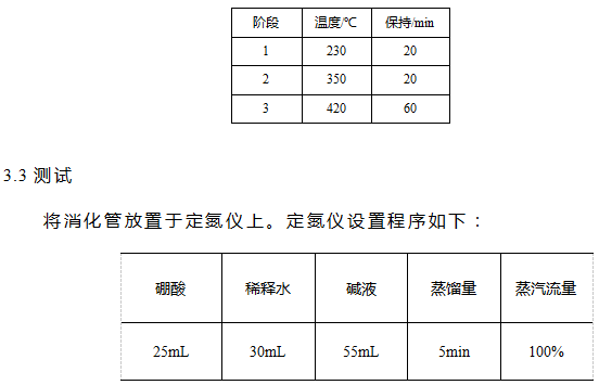 稱取樣品1g(精確值0.1mg)左右,加入消化管。加入混合催化劑5g:由97g含10個結晶水的硫酸鈉(Na2SO4·10H2O),1.5g含5個結晶水的硫酸銅(CuSO4·5H2O)和1.5g硒(Se)組成,加入濃硫酸15ml。