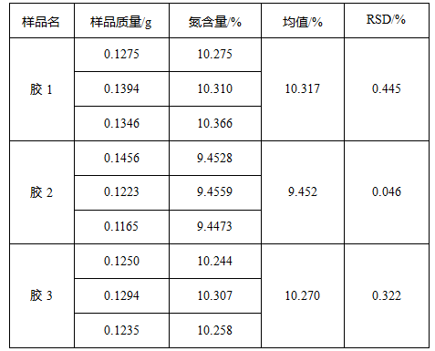 根據國標HG/T 2755-1996《酚醛樹脂中六亞甲基四胺含量的測定》規定:進行平行測定,計算兩個試驗結果的算術平均值,兩個試驗結果之差需小于5%。可見用凱氏定氮法測定酚醛樹脂中的氮符合行業標準要求,且平行性良好,操作簡單。