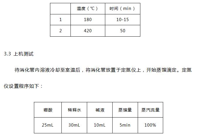 硫酸(分析純)、硼酸(分析純)、氫氧化鈉(分析純)、溴甲酚綠-甲基紅混合指示劑、硫酸鉀(分析純)、硫酸銅(分析純)、0.1mol/L硫酸標準滴定液等。