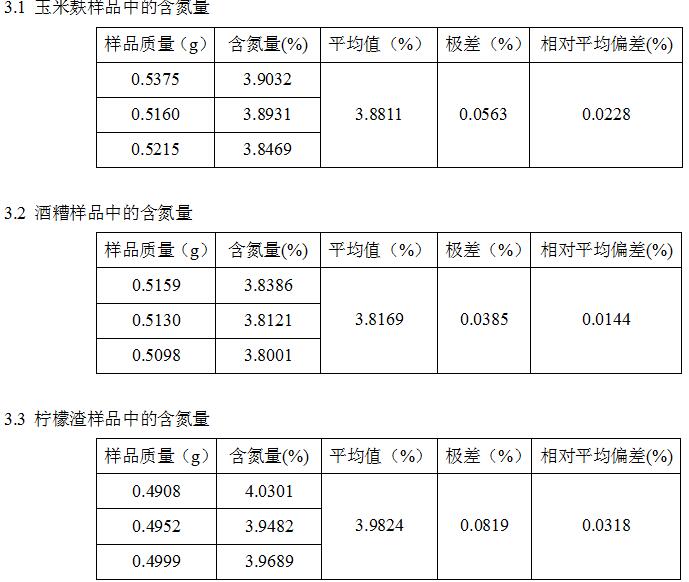 以上三組數據顯示,使用K1100凱氏定氮儀測定植物性飼料中的含氮量,所得誤差及平均偏差均在允許范圍之內。