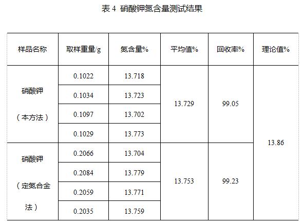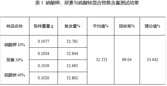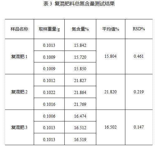 使用此方法進行測試的結果符合《GB/T 8572-2010 復混肥料中總氮含量的測定 蒸餾后滴定法》中規定的平行測定絕對值小于0.3%的要求,并且RSD值均小于0.5%,重復性良好。