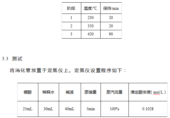 硫酸(分析純),20g/L硼酸溶液,溴甲酚綠-甲基紅混合指示劑,40%氫氧化鈉,混合催化劑壓片(3gK2SO4、0.2gCuSO4),0.1mol/L硫酸標準滴定液。