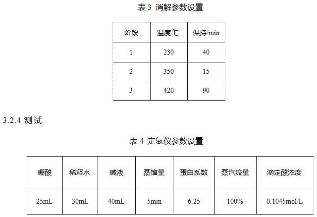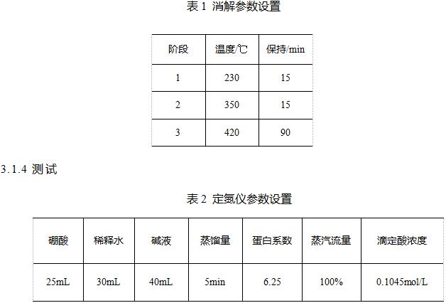 稱取混合均勻的樣品0.2g(精確至0.1mg)左右,加入消化管。加入混合催化劑:3g硫酸鉀,0.2g硫酸銅,沿消化管壁加入濃硫酸10mL。