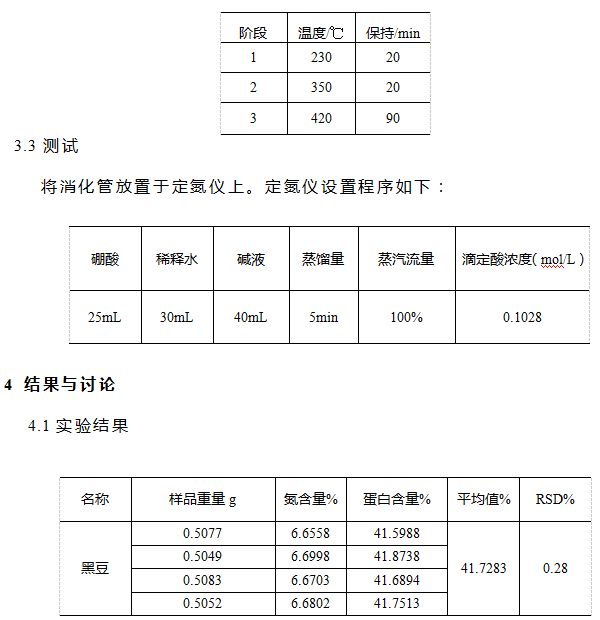 以上數據顯示,使用K1100F凱氏定氮儀測定黑豆中的蛋白質含量,所得結果誤差均在允許范圍之內。