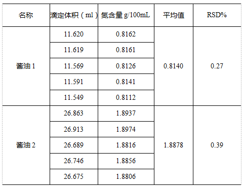 使用K1100F凱氏定氮儀測定醬油中的全氮含量,所得結果誤差均在允許范圍之內。參照《GB 18186-2000 釀造醬油》全氮含量的理化指標要求,醬油1為三級,醬油2為特級。