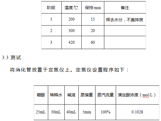 硫酸(分析純),20g/L硼酸溶液,溴甲酚綠-甲基紅混合指示劑,40%氫氧化鈉,混合催化劑壓片(3gK2SO4、0.2gCuSO4),0.1mol/L硫酸標準滴定液。