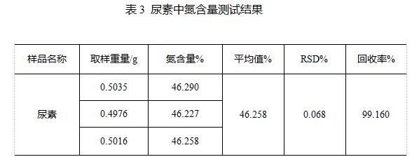 測試結果顯示本次測試的氮含量均值為46.258%,回收率為99.160%。且重復性滿足《GB/T 2441.1-2008 尿素的測定方法 第1部分:總氮含量》中平行測試結果絕對差值不大于0.1%的要求。