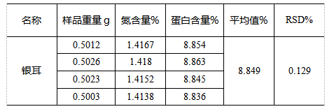 實驗數據顯示,使用K1100F凱氏定氮儀測定銀耳中的蛋白質含量符合《NY/T834-2004 銀耳》中粗蛋白≧6%的要求,所得結果誤差均在《GB/T 15673-2009 食用菌種粗蛋白含量的測定》標準要求兩個測定值的絕對差值不得超過算術平均值的10%。