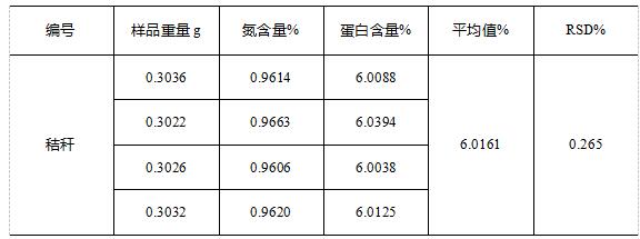 所得結果誤差符合國標《GB/T 6432-94 飼料中粗蛋白的測定方法》要求的兩次獨立測定結果與其算術平均值的絕對差值與該平均值的比值不超過1%。