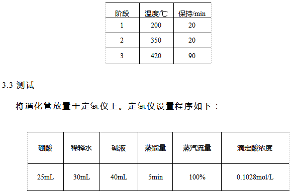 硫酸(分析純),20g/L硼酸溶液,溴甲酚綠-甲基紅混合指示劑,40%氫氧化鈉,混合催化劑壓片(3gK2SO4、0.2gCuSO4),0.1mol/L硫酸標準滴定液。