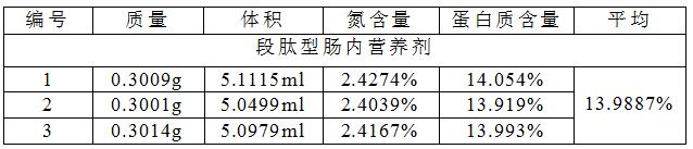 短肽型腸內營養劑中的有機態氮在濃硫酸和催化劑的共同作用下,轉化為氨態氮。加堿蒸餾后,用硼酸吸收后,再以硫酸標準滴定液進行滴定。