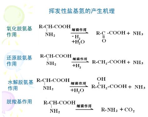 蛋白質在酶和細菌的作用下分解后產生堿性含氮物質,有氨、伯胺、仲胺等,此類物質具有揮發性,測定時使用高氯酸溶液浸提,在堿性溶液中蒸餾出后,用硼酸吸收液吸收,再以標準滴定酸溶液滴定計算含量。