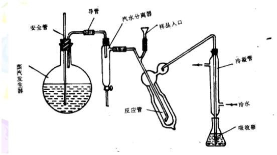 蒸餾:預先將盛有10ml吸收液并加有5-6滴混合指示液的錐形瓶置于冷凝管下端,并使其下端插入錐形瓶內吸收的液面下,精密吸取5ml上述樣品濾液于蒸餾器反應室內,加5ml 1%氧化鎂混懸液,迅速蓋塞,并加水以防漏氣,通入蒸汽,待蒸汽充滿蒸餾器內時即關閉蒸汽出口管,由冷并行管出現第一滴冷凝水開始計時,蒸餾5min即停止。