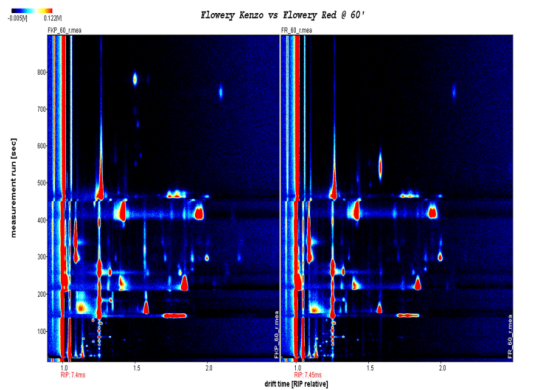 氣相離子遷移譜(GC-IMS)技術,在無需復雜樣品前處理的條件下,可直接對固體/液體(頂空進樣)、氣體樣品進行進樣分析,快速分析(5-15min)可得到樣品揮發性有機物的指紋圖譜,用戶一眼便可看出樣品間的差異,據此可用于香精香料配方的研究、新產品的研發、一致性的研究等。