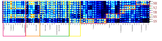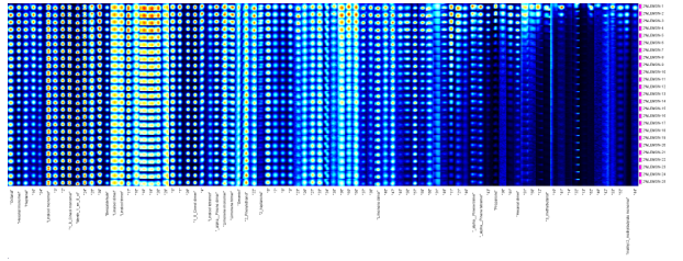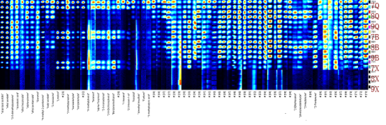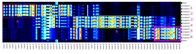2) 圖中每一列為同一保留時間及漂移時間下的有機物(不同樣品中相同的物質)的信號峰;