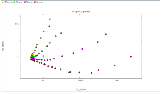 添加不同比例香精的護膚品在皮膚上留香時間的PCA分析如下圖: