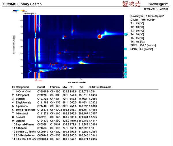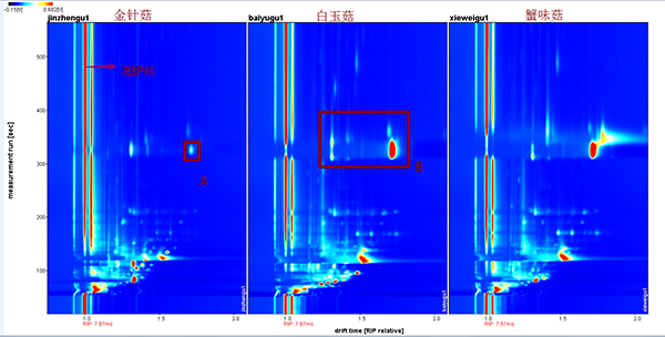 使用G.A.S.公司FlavourSpec®風味分析儀,在無需樣品前處理前提下,經孵化頂空進樣后可快速檢測食用菌揮發性有機物,儀器配備的強大功能軟件可給出樣品的氣相離子遷移譜圖及揮發性有機物的指紋譜圖,通過揮發性有機物的氣相離子遷移譜圖,我們可以: