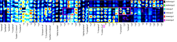 結論:經FlavourSpec®快速分析,可快速識別金針菇、白玉菇及蟹味菇中揮發性有機物的區別與差異,從指紋譜圖中可知金針菇與白玉菇、蟹味菇的差異很大,特征信號峰非常明顯;而屬于同類不同變種的白玉菇和蟹味菇在揮發性有機物上也存在差異。