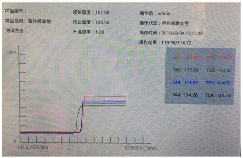 紫外線吸收劑是目前應用最廣的一類光穩定劑,按其結構分為水楊酸酯類、二苯甲酮類、苯丙三唑類、取代丙烯腈類等。苯丙三唑類紫外線吸收劑能強烈吸收波長為270~380nm的紫外線,化學穩定性好,揮發性極小。與聚烯烴的相容相好,特別適用于聚乙烯和聚丙烯。該品具有優良的耐熱升華性,耐洗滌性、耐氣體褪色性和機械性能保持性。與抗氧化劑并用為顯著的協同效應。要改善制品的熱氧穩定性。測定苯丙三唑類紫外線吸收劑的熔點對于鑒定其純度具有很大價值。本文選擇兩種升溫速率進行測試,實驗證明,1℃/min的速率結果更平行。
