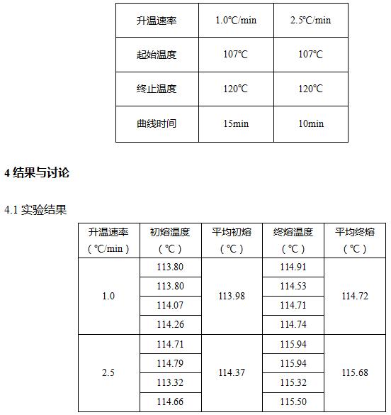 樣品熔化過程中易分層,且熔化后樣品量減少,分析原因可能出現升華的現象,所以在實驗時選擇了兩種升溫速率:1.0℃/min和2.5℃/min。實驗結果和圖譜證明在1.0℃/min時的結果平行性更好,圖譜更加趨于一致。所以建議升溫速率1.0℃/min。
