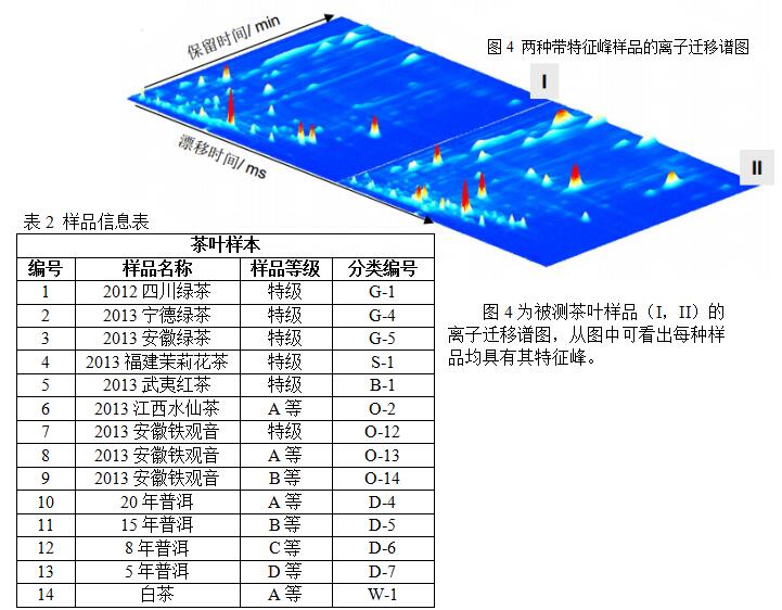 茶葉的香味來源于3-己烯醛,2,3-丁二酮,壬烯醛,單萜類等揮發性的有機物,離子遷移譜(IMS)對這些化合物具有靈敏的響應度,故可用于茶葉揮發性有機物的測定。通過FlavourSpec®(圖1)測定茶葉的頂空組分信息,可用于鑒別茶葉等級/原產地,以及確定茶葉儲藏時間。