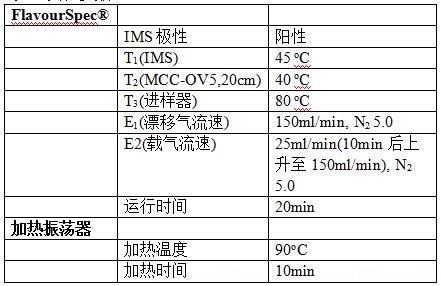 所有的檢測均由FlavourSpec®完成,FlavourSpec®配備頂空自動進樣器,采用恒溫加熱多維毛細管柱(5%聯苯-95%二甲基聚硅氧烷,MCC-OV5;20cm,0.2μm)對樣品進行有效分離,實驗參數如下表(表1)。