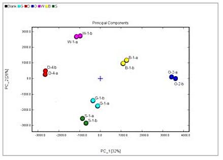 如圖7所示,茶葉的等級能通過特殊揮發性有機物信號峰的有無及強度進行分類。使用FlavourSpec®分析樣品: