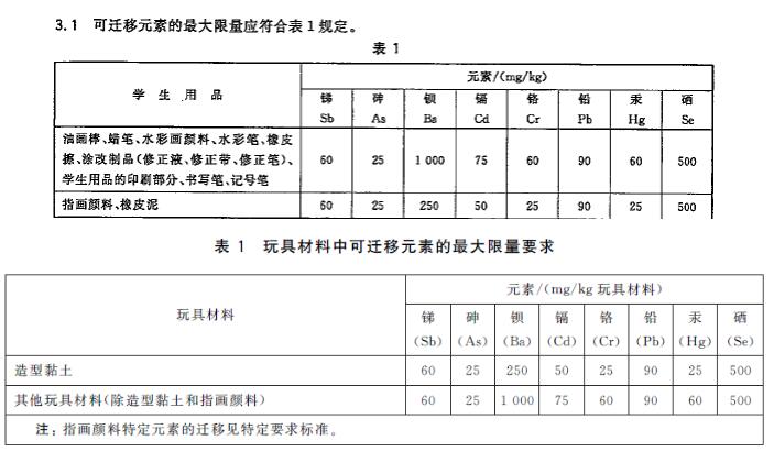孩子通過玩具、文具攝入重金屬,主要是因為誤食碎粒導致。學生文具檢測遵循《GB 21027-2007 學生用品的安全通用要求》,其中對于重金屬的描述為可遷移元素,下表是限量規定: