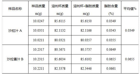 從以上數據可以看出兩種不同品牌沙拉(醬)汁中抽提出的粗脂肪含量很低。沙拉(醬)汁里面添加了一些植物配料如胡蘿卜、蔥花等,索氏抽提過程中也會將這類配料中的植物色素、蠟質抽提出來。由此可判定,該兩種品牌沙拉(醬)汁符合其營養參考值中標注的0脂肪是可信的。