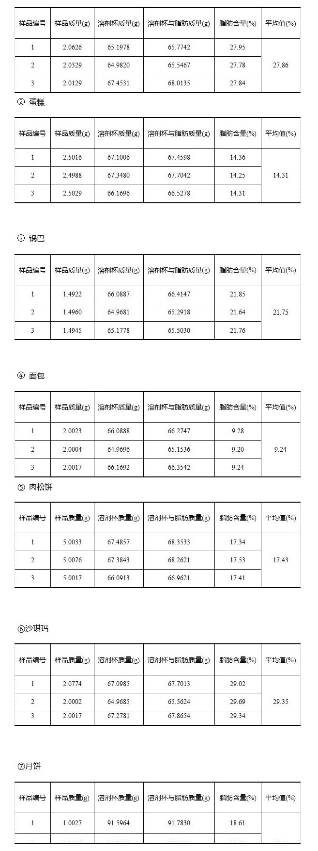 由實驗結果可知,糕點類食品脂肪含量較高,萃取時間根據樣品質量和脂肪含量增多相應加長;當該種類樣品量為1.5-5g時,建議萃取時間設置大于3h,以便取得更好的測試結果。