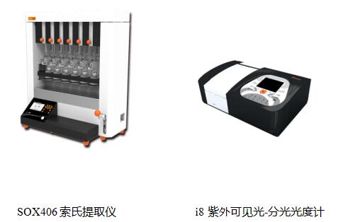SOX406索氏提取儀;i8紫外可見光-分光光度計;分析天平;鼓風干燥箱;干燥器;旋風磨;100mL量筒。