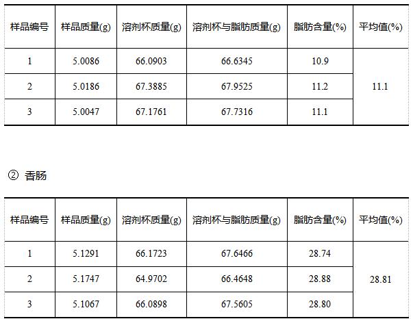 《GB/T 9695.7-2008 肉與肉制品 總脂肪含量測定》中重復性規定:同一分析者在同一實驗室、采用相同的方法和相同的儀器、在短時間間隔內對同一樣品獨立測定兩次。兩次測試結果的絕對差值不超過0.5%。實驗各樣品三次獨立測定結果符合標準要求。