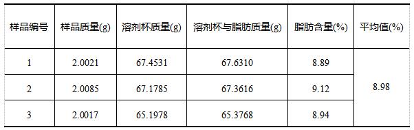 《GB 5009.6-2016食品安全國家標準 食品中脂肪的測定》中對于精密度規定:在重復性條件下獲得的兩次獨立測定結果的絕對差值不得超過算術平均值的10%。實驗各樣品三次獨立測定結果絕對差值均未超過算術平均值的10%,符合標準要求。