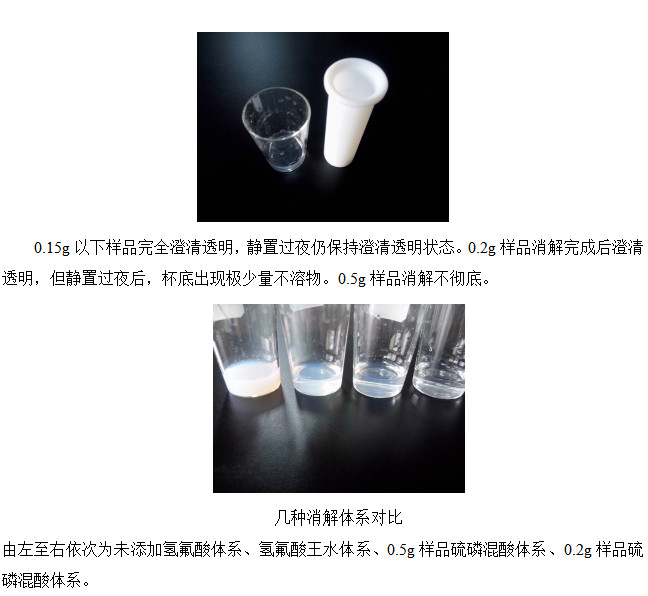 以上仍呈現乳濁狀態。而添加氫氟酸的消解體系,樣品靜置半小時后出現沉淀現象。所以,判定樣品中二氧化硅或者硅酸鹽的含量比較高。