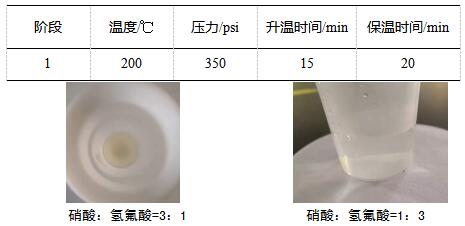 經過實驗,海能應用實驗室推薦硅粉使用硝酸和氫氟酸,比例為1:3,消解溫度大概200℃,消解實驗在30~40min,取樣量在0.1左右,消解效果最佳。