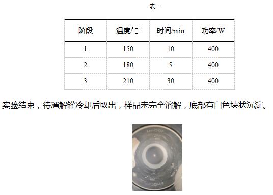 實驗結束,待消解罐冷卻后取出,樣品未完全溶解,底部仍有白色塊狀沉淀。