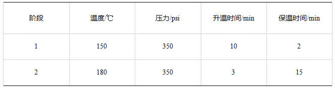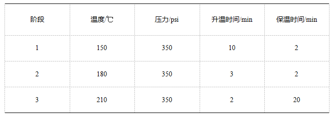 稱取5組樣品質量為0.5g(精確至0.1mg),另外添加一組空白,分別加入6mL濃硝酸和2mL過氧化氫,室溫靜置一段時間,待其反應完全后,則組裝消解罐,按照如下設置參數進行消解:
