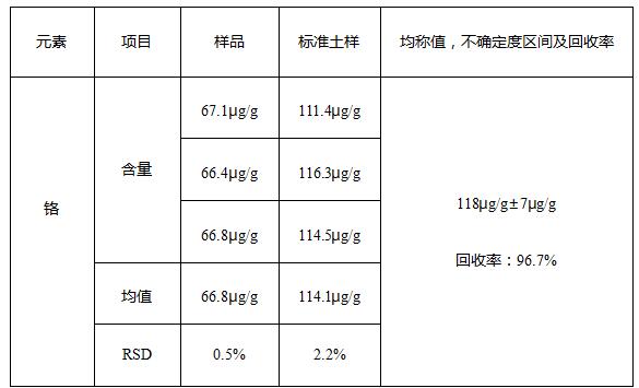 土壤樣品中鉻含量為66.8ppm,測量結果的RSD=0.5%,表明重復性較好。標準品回收率為96.7%,證明此用此方法處理土壤樣品,元素損失較少。