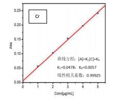 分別精密移取0.0mL、0.1mL、0.2mL、0.3mL、0.4mL、0.5mL鉻標準溶液置于5個100mL 容量瓶中,用質量分數1%硝酸溶液稀釋至刻度,得到每1mL 溶液含鉻分別為0μg、1μg、2μg、3μg、4μg、5μg的系列標準溶液。