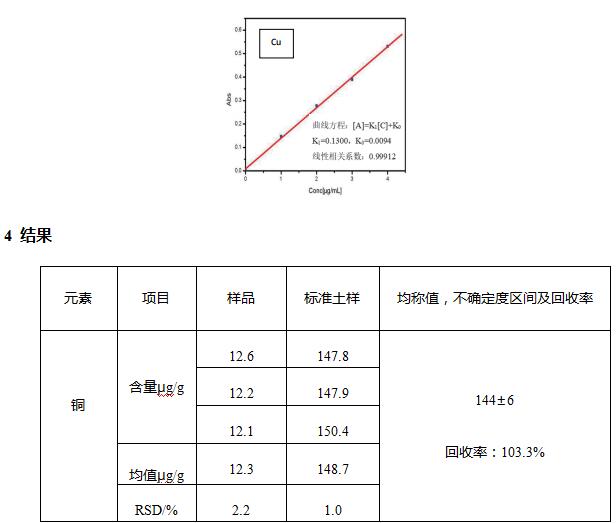 土壤樣品中銅含量為12.3ppm,測量結果的RSD=2.2%,表明重復性較好。標準品回收率為103.3%,證明此用此方法處理土壤樣品,元素損失較少。