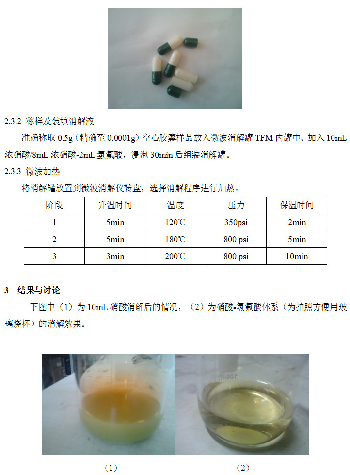 本文采用了硝酸、硝酸-氫氟酸消解體系對空心膠囊進行微波消解制樣,前者消解后液體較為渾濁,后者液體澄清。