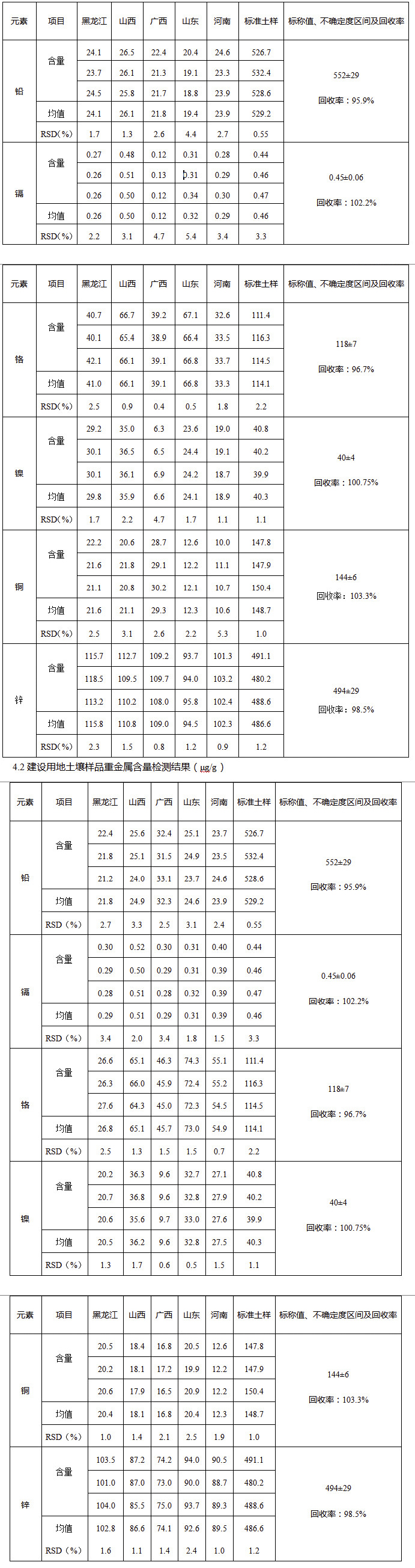 土壤樣品和標準土壤檢測結果如下: