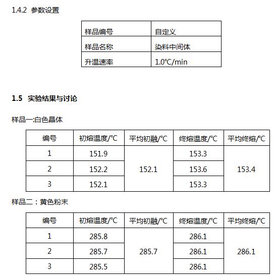 1.4.1 測定方法:將樣品在烘箱內以適合的溫度烘至恒重,將其裝入毛細管中,高度約3-5mm左右,注意裝樣時需均勻、顛實、所裝樣品的高度最好保持一致。設置儀器參數后進行實驗,記錄結果。