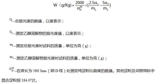 稱取5g制備好的試樣,精確至1mg,定量轉移到干燥的100mL容量瓶中,加40mL乙醇溶液(40%),振搖至形成均勻的懸濁液,然后再加40mL乙醇溶液(40%),加適當濃度的鹽酸以補充試樣的耗酸量,使瓶中內容物的體積變化不超過1ml。用力振搖,在室溫下靜置1h,在此期間至少每隔10min振搖一次。用乙醇溶液(40%)稀釋至刻度,混勻,過濾,棄去最初數毫升溶液。吸取50mL濾液于100mL容量瓶,加入2.0mL鹽酸溶液(7.73mol/L)用力振搖,并將其浸入沸水浴中。15min±5s后,從水浴中取出容量瓶,立即加溫度不超過10℃的水30mL,轉動容量瓶并在冷水中冷至20℃左右。加5mL亞鐵氰化鉀溶液,振搖1min,加5ml乙酸鋅溶液,振搖1min,用水稀釋至刻度,搖勻,過濾,棄去最初數毫升濾,用旋光度測定濾液的旋光度(α2)。