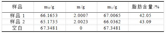 由表格中數據可知,所做的空白樣品在實驗前與實驗后質量未增加,即空白中不含脂肪。