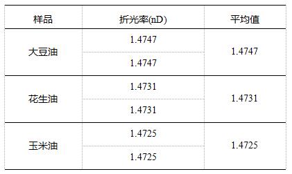 從上表中可以看出,用全自動折光儀檢測食用油的折光率重復性很好。并且操作簡單,節省了人力和時間。實驗中采用三種食用油,通過其折射率值可初步判斷食用油的品種。而對于折射率非常接近的品種,僅從折射率還不能直接判斷,需借助其他方法如氣味等。